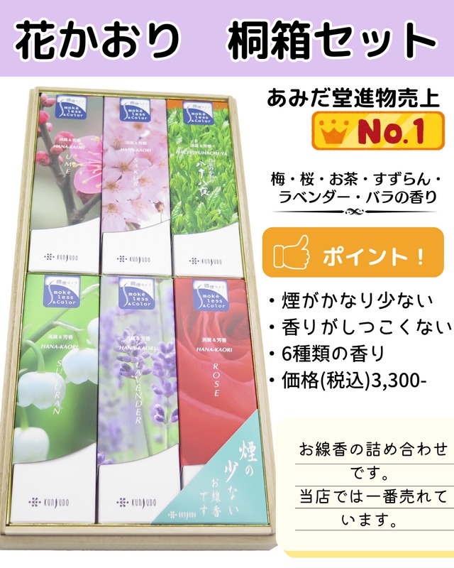 花かおり 桐箱セット 当店で最もご購入されています! 煙が少なく、香りもしつこくないお線香「花かおり」シリーズのギフトセットです。 人気の「さくら」「ラベンダー」「ローズ」に加えて、「梅」や変わり種の「お茶」、さわやかな残り香が心地よい「すずらん」の6種類を、ご進物用に桐箱に納めたセットです。 当店では、年間を通じて最も多くご購入されるギフトセット。最近ニーズが高まっている”煙の少ないお線香”で、かつ”比較的控えめな香り”で”6種の香りを楽しめる”というのも選ばれている理由のように思います。 ギフト線香は、当ショップから直接お相手様へ発送できます。 包装、掛け紙(熨斗)、贈り主様のお名前は、オプションよりお選びください。 (特にご要望がなければ、「包装:”あり”」、「掛け紙(のし)の有無:”あり”」、「表書き:”御供”」、「掛け紙(のし)名入れ:”あり”」、「”贈り主様のフルネームを記入”」がおすすめです。 ※紙袋については、直接お相手様に贈られる場合はマナー上必要ありません。お客様が直接手渡しされる場合は、”必要”をお選びください。 納品書について ご購入者様にメールにてお送りしております。 ※お相手様には、納品書など金額が確認できるものは一切送りませんので、ご安心ください。 領収書について 当ショップでは、領収書を発行しておりません。各種決済のご利用明細をご確認いただきますようお願いいたします。 ▼商品詳細▼ 【線香長さ】 標準(約13.5cm) 【内容量】 梅・桜・八十八夜(お茶)、すずらん、ラベンダー、ローズの6種入 【燃焼時間】 約20分程度 【煙の量】 八十八夜(お茶)…煙少な目 ほか、梅・桜・すずらん・ラベンダー・ローズ…煙かなり少ない 【桐箱寸法】 約33cm×約16cm×約4.5cm ※商品実寸を記載。
