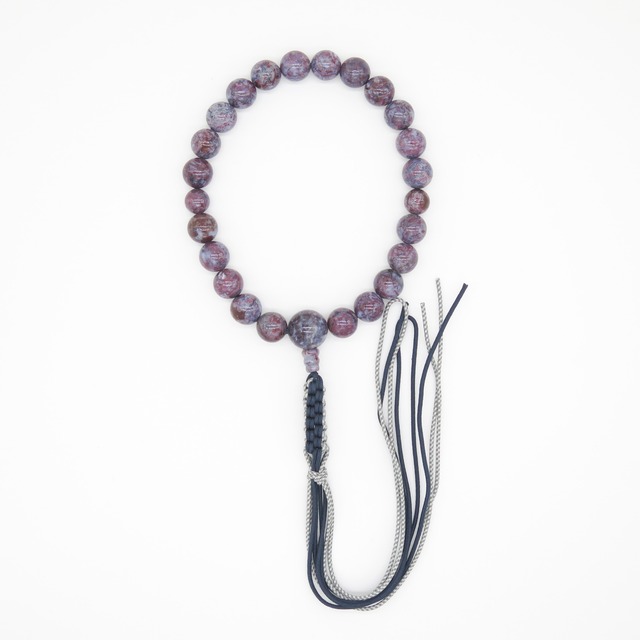 男性用・宗派を問わずご使用いただけます。 美しい天の川のようなキメの細かい光沢が特徴の紫金石。繊細な輝きが人気の紫金石を大胆にカットし、より魅力的に仕上げた逸品です。 光沢があるといっても、紫金石の地の色が深いために悪目立ちするような光り方ではないです。 【商品詳細】 一輪念珠 紫金石(カット入り) 共仕立 正絹房
