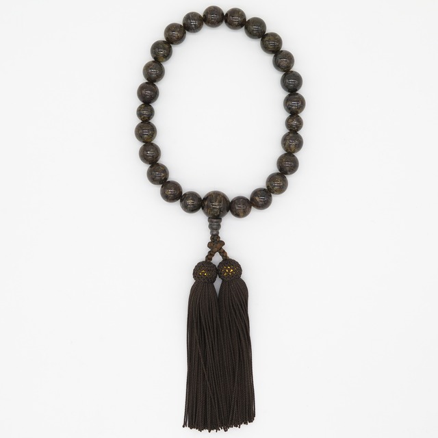 男性用・宗派を問わずご使用いただけます。 ブロンザイトは、ダークブラウンの石の中に銅のようなメタリックな輝きを内包した天然石です。 石の持つ独特な見た目と重厚感で人気の念珠です。 こちらは、標準的なサイズ(22玉サイズ)となっております。平均的な男性のてのひらサイズにピッタリなサイズです。 【商品詳細】 一輪念珠 ブロンザイト 22玉 共仕立 正絹房