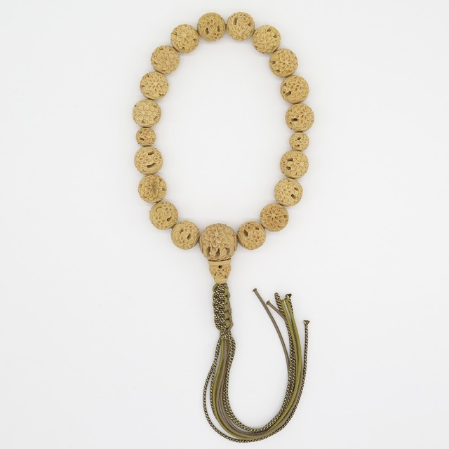 黄楊(つげ)の珠に菊花の彫を施した念珠です。 菊の花の花びら一枚一枚に至るまで丁寧に彫り込まれた逸品。 18玉と男性用の念珠としては大きめの珠のため、彫り込みの立体感も相まって存在感は抜群です。 使い込まれてゆくと手の脂が徐々になじんでいきますので、より深い色合いに変化していきます。 【商品詳細】 一輪念珠 黄楊 菊花彫 共仕立 紐房8本 (浄土真宗・男性本式念珠)