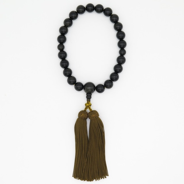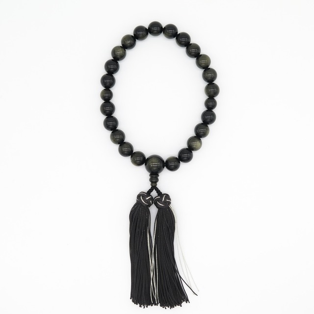男性用・宗派を問わずご使用いただけます。 金黒曜石とは、火山岩の一種「黒曜石」の仲間です。特有の黒艶を持り、角度を変えると時折金箔のような黄金色の輝きを見せる希少な鉱石です。 こちらは、標準的なサイズ(22玉サイズ)となっております。平均的な男性のてのひらサイズにピッタリなサイズです。 【商品詳細】 一輪念珠 金黒曜石 22玉 共仕立 正絹房