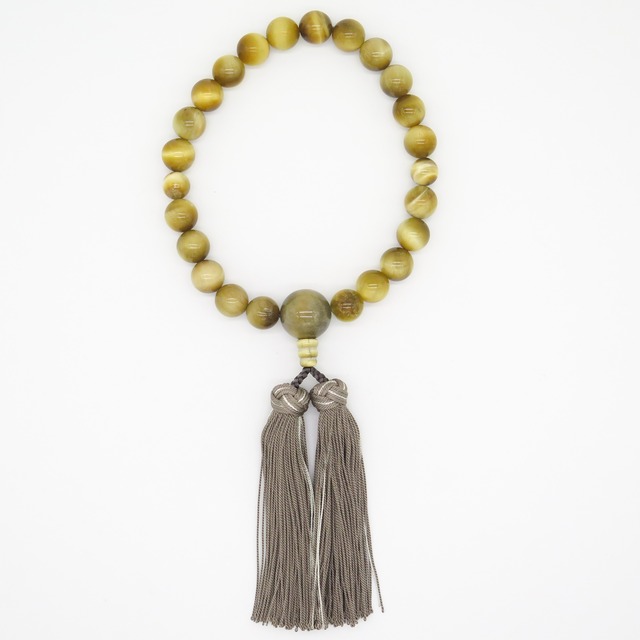 男性用・宗派を問わずご使用いただけます。 念珠の定番品である「虎目石」よりも明るい「金虎目石」を使用した念珠(数珠)です。 房には古都房を使用し、明るくやわらかな印象になるように仕上げております。 こちらは、標準的なサイズ(22玉サイズ)となっております。平均的な男性のてのひらサイズにピッタリなサイズです。 【商品詳細】 一輪念珠 金虎目石 22玉 共仕立 正絹古都房