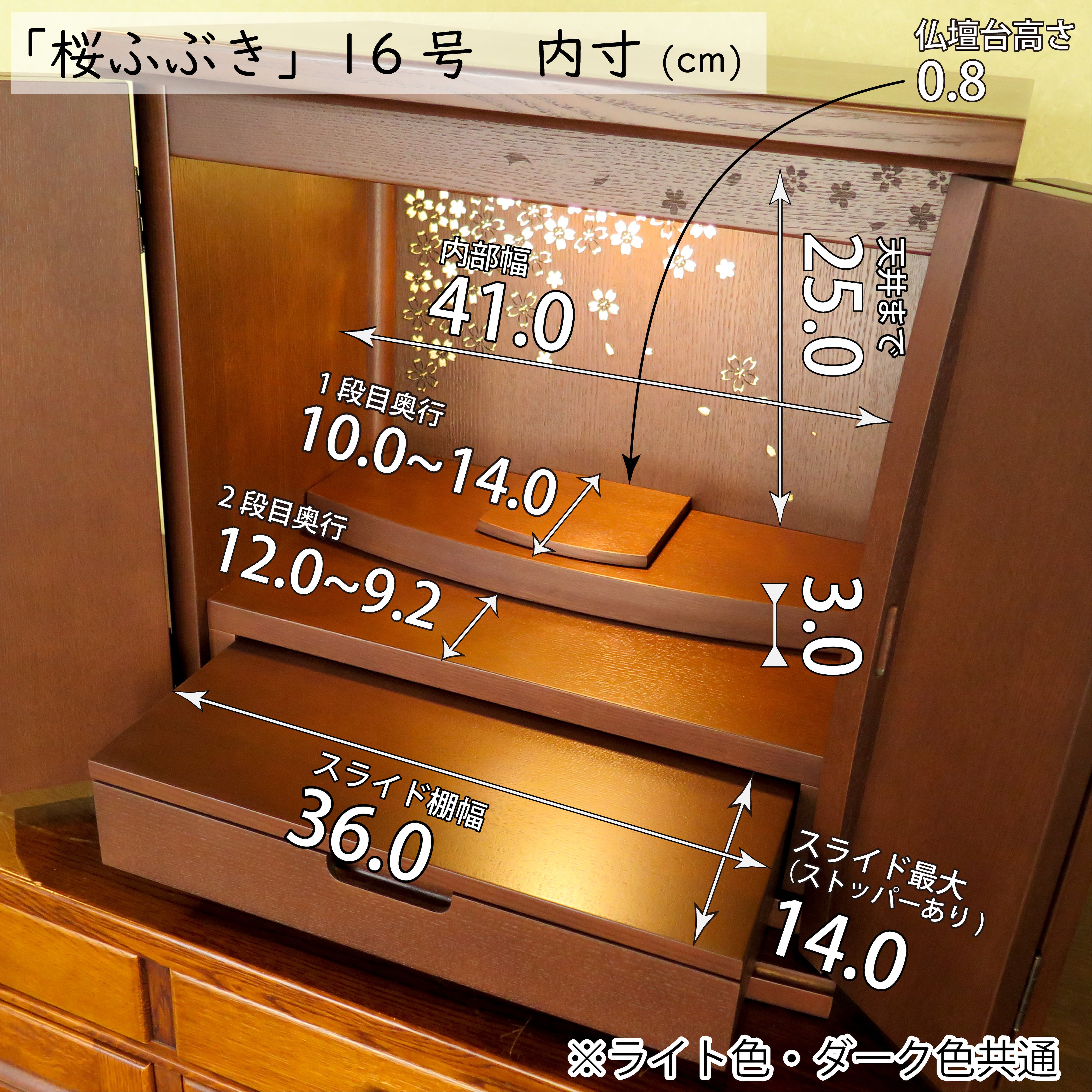 桜ふぶき 上置 16号 ライト色は、美しい桜の透かし彫が印象的なお仏壇です。家具の町・旭川で作られており、デザインだけでなく質の良い造りも魅力的なお仏壇です。
