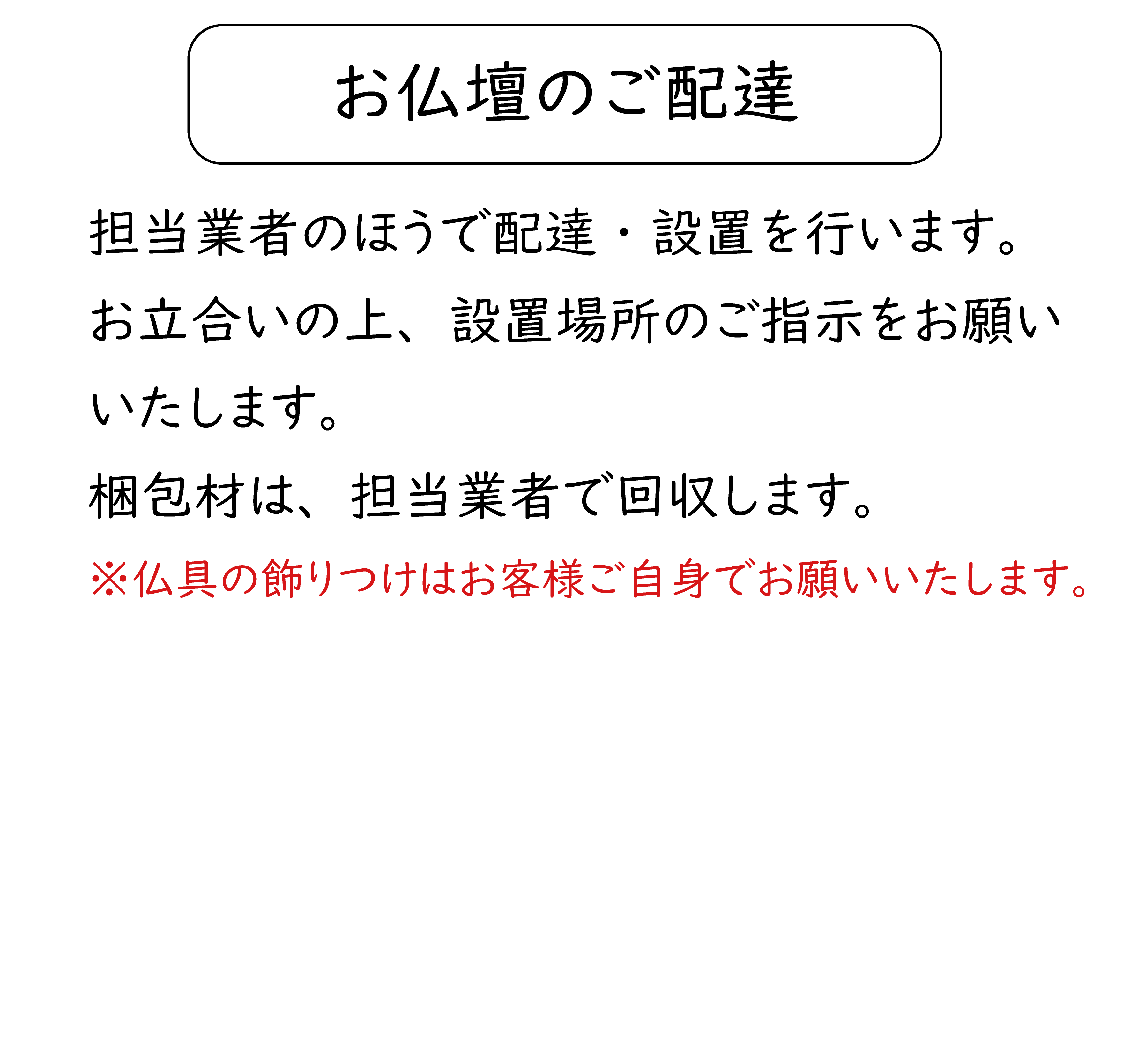 ただし、仏具の設置はお客様自身でお願い致します。※ヤマトスタッフは、仏具の配置についてお答えできません。仏壇・仏具に関するご質問は、店舗にご連絡をお願いいたします。